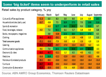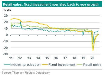 China’s recovery from the covid-19 shock has been led by industry and by the supply side, but – with a lag – domestic demand is also rapidly normalising. That was illustrated by the monthly activity data for September. Industrial production accelerated by 6.9% yoy in September (consensus: 5.8%, August: 5.6%). Retail sales growth rose to 3.3% yoy (consensus: 1.6%, August: 0.5%). Urban fixed investment improved to 0.8% yoy ytd (consensus: +0.9%, August: -0.3%). So, although the catch-up effects from the covid-19 collapse in Q1 have clearly faded compared to Q2, growth momentum remains strong as we head into Q4. Bloomberg’s monthly GDP estimate jumped to a 15-month high of 6.8% yoy in September.