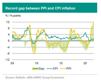 In line with consensus expectations including ours, the acceleration in China’s producer price inflation (PPI) continued in October. The annual rise of producer prices reached a 26-year high of 13.5% yoy (September: 10.7%, consensus: 12.3%). The renewed rise in PPI inflation over the past months is still mainly driven by commodity-related sectors, resulting from the global rise in commodity prices, and aggravated by a domestic power crunch. Producer price inflation will likely stay high for a while, although underlying pressures have started easing. We have seen some correction in commodity prices and some easing of energy-related policies in China. Meanwhile, the gap between PPI and CPI inflation has risen to a new historic high of 12 %-points, even though there are more signs of a passthrough of higher PPI-inflation into consumer price inflation (CPI). CPI inflation rose to a 13 month high of 1.5% yoy in October (September: 0.7%, consensus: 1.4%). While the passing through of higher costs by producers is playing an increasing role in the rise of CPI inflation (non-food prices rose by 2.4% yoy), so is the fading of food price deflation. Still, consumer price inflation as well as core inflation (1.3% yoy in October) remains rather subdued, partly reflecting the weak state of domestic demand. All of this should still leave some room for a moderate, 'piecemeal', policy easing to support growth in our view. We still expect a 50bp RRR cut in the coming months, next to ongoing moderate fiscal support in the form of increasing the financing space for local governments.