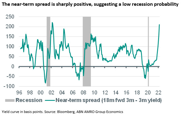 The Fed published a analysing the various yield curve measures and their predictive value of recessions. It found that the 18m forward implied T-Bill yield minus the current 3m T-Bill yield statistically outperformed longer term yield curve measures in predicting recessions, while having the advantage of not being subject to the same term premium issues that the longer-term yield curve has. This also has an intuitive logic – the 18m forward implied 3m yield gives an indication of whether the market thinks the Fed would be cutting rates in 1.5-2 years’ time if it is lower than near-term rates. This so-called near-term spread is now historically high, i.e. nowhere near inversion, and suggesting a low risk of recession. We would only add one important caveat in the current environment, which means we cannot draw too much comfort from this: inflation is far above the Fed’s target, and the market could take the view that even with a recession, the Fed would not be easing policy as its priority is to bring inflation back to target. Put another way: we do not as a base case expect a US recession (although ), but the fact that the near-term yield spread is sharply positive does not rule out a recession either.
