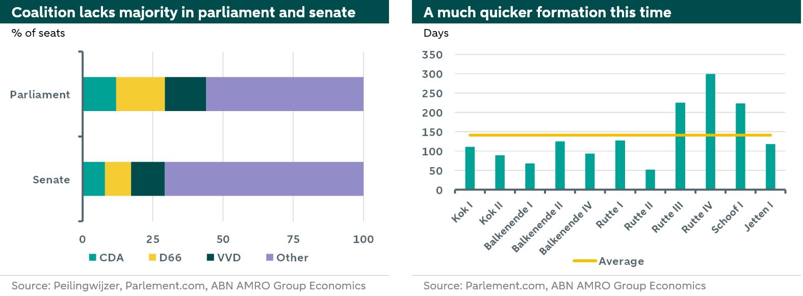 Prime Minister to be Jetten’s cabinet will form a minority government resting on 66 seats in parliament (76 needed for a majority). Also, in the Senate the coalition has just 22 seats (38 needed for a majority). This means that for every policy measure, opposition support needs to be found in both chambers. The opposition indicated it is willing to cooperate but will probably be very critical and likely seek bargaining chips for policies elsewhere even if they agree with proposed policies. Crucial will be the Greenleft/Labour party, the biggest opposition party, which could provide the required votes for a majority in parliament and, almost, the senate. However, the proposed cuts to healthcare spending and social security are at odds with their party manifesto. In general, because of the minority status, the risk that today’s proposed policies are watered down, or only partly implemented due to opposition requests, is high.