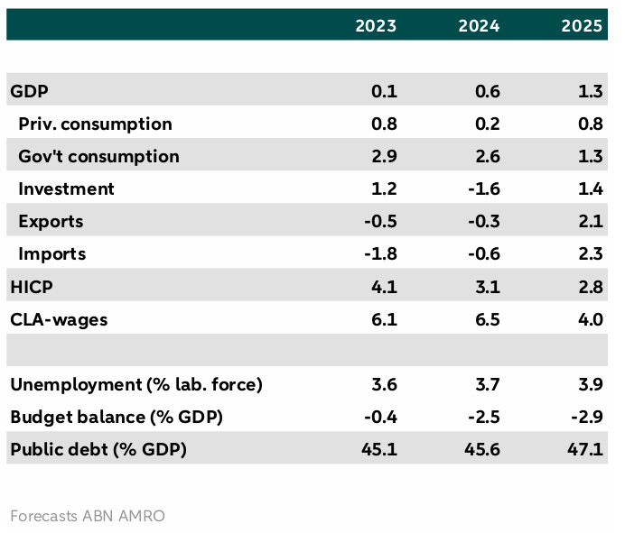 Due to weak growth prospects, geopolitical uncertainty and the tight labour market, companies are reluctant to invest. Investments have been lagging GDP trends since 2019. An additional reason for this, is the sharp decline in transport equipment investments, such as cars and commercial vehicles. However, helped partly by a packed government investment agenda, investment growth remains positive in the coming quarters. The annual figure for 2024 will nevertheless be negative, but this is due to statistical spillovers from 2023.