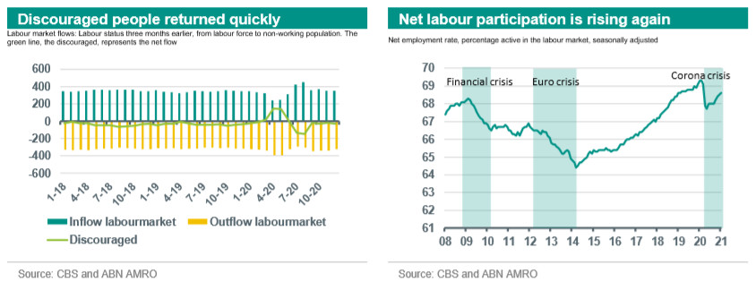 The limited increase in unemployment during the corona crisis is largely due to the government support package. It is estimated that 28% of companies with more than two employees made use of the wage subsidies (NOW). Thanks to this scheme, many workers have kept their jobs even though their employers have been hit hard by the corona crisis. The reason why unemployment has fallen in recent months is more difficult to explain. There are no clear signs that workers have become discouraged and have withdrawn from the labour market because they see no job opportunities. The graphs below show that, while the number of discouraged people rose sharply in the second quarter of last year, the net number of workers entering the labour market have been positive since. The net labour force participation rate, the percentage of the population between the age of 15-75 that is active in the labour market, is still high compared to historical levels. for the drop in unemployment is probably the flexibility of the labour market. Workers who lost their jobs at the beginning of the crisis (mostly flex workers), later found work again in the relatively labour-intensive sectors benefiting from the corona crisis, such as distribution centres and delivery services.