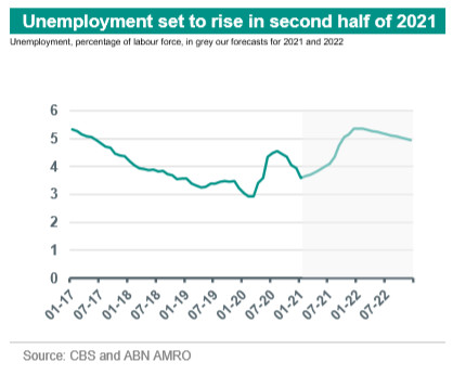 We expect another drop in employment during the second quarter of this year, when GDP is expected to contract. Additionally, a proportion of the people that are receiving labour subsidies (NOW) are at risk of losing their jobs when the government withdraws support as lockdown measures are eased in the second half of 2021. This will inevitably lead to a further rise in unemployment. We expect the unemployment rate to go up to 5,5% at the end of 2021.