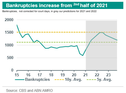The gradual withdrawal of support measures from the third quarter of 2021 will lead to more bankruptcies. A large part of the government support was liquidity support in the form of tax deferrals. Moreover, in the supply chain, for example, suppliers and banks have also granted payment holidays. For some entrepreneurs, the burden of debt will be too large compared to the income streams. We expect a gradual increase in the number of bankruptcies from the third quarter of 2021 onwards, with a peak around the spring of 2022. We expect this peak to be around 1,500. This is equivalent to the average number of bankruptcies over the past 10 years. In the quarters following this peak, the number of insolvencies will decrease to a level comparable to the pre-corona situation.