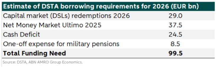 For next year, we expect the funding need to amount to approximately EUR 100 billion, which is about EUR 20 billion higher than our estimated final funding need for this year. There are two reasons why the funding need will be higher in 2026. Firstly, two DSLs will expire next year, whereas only one DSL expired in 2025. The difference, EUR 9 billion, increases the funding need for next year. Secondly, the budget deficit will be higher next year at 2.7% compared to 1.9% this year. The expected deficit also includes a one-off EUR 8.5 billion payment for military pensions to the civil service pension fund ABP. ABP will transition to the new pension system effective 1 January 2027 and since no contributions were paid for pensions accrued before June 2001, a reserve has been budgeted for 2026 to compensate for this under the new system.