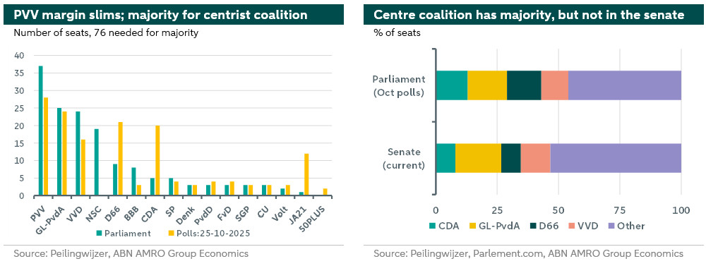The Dutch head to the ballot box coming Wednesday, polls suggest that support for the four largest parties has converged. A centrist 4-party coalition now could have a majority, but is being ruled out for now by the centre-right VVD party-leader Yeşilgöz. Such a coalition has overlap but also large differences, suggesting a challenging formation process lies ahead. The election programme of each of the parties points to higher deficits in the coming years... but for next year, we expect the impact on the funding need to be limited because the policy changes will take time to have an effect. Unlike two years ago, the pension transition is not on the political agenda during these elections.
