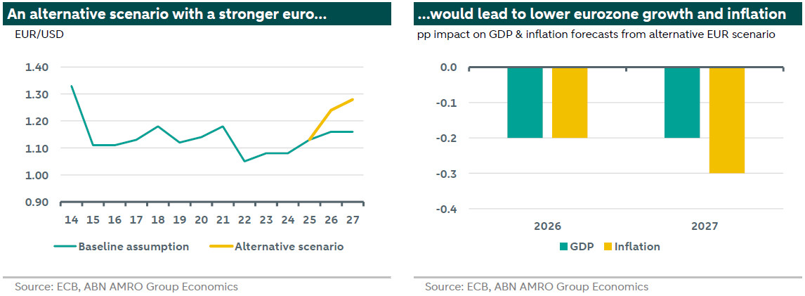 A scenario along the lines of the ECB’s alternative for EUR/USD, where inflation is projected to undershoot the ECB’s target in 2027, could lead to second leg of the rate cut cycle. The average of the models presented by the ECB, suggests that a 100bp rate cut would be needed to correct an undershoot of 0.3 percentage points. So all else equal, this would take the deposit rate down to 1%. However, there might be other effects at play. For instance, depending on its severity, the impact of this might also have to be weighed against possible inflationary spillover effects from the US. This could materialise if the US sees a de-anchoring of inflation expectations, and ergo much higher inflation. In addition, the ECB currently is not fully factoring in the impact of Germany’s fiscal stimulus in our view. Meanwhile, a much more negative scenario, where loss of confidence in the US dollar and US Treasurys as a global safe liquid asset, could lead to a sharp tightening of financial conditions and volatile markets that may necessitate a more aggressive response from the ECB.