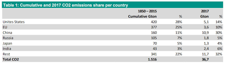 Historically the US has been the largest CO2 emitter, and on annual basis currently the second largest emitter following China. The USA has cumulatively emitted 420 Gigaton CO2 from 1850 to 2015. This implies around 28% of the current 1 degree global temperature forcing is attributable to the USA. The EU follows in a close second with 25%.