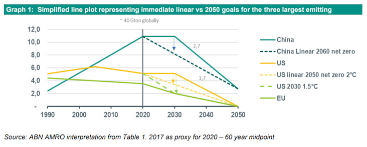 In considering how the next 10 years could unfold between these three large emitters. The absolute amount of emissions from the US and China are such that their combined role can negate all gains made from the EU’s 28 countries. For illustration purposes, graph 1 plots a simplified impact of a linear path to 2050 vs keeping emissions level to 2030 and then a sudden steeper transition path to 2050 for the US and China. The combined impact from the US and China is a difference in emissions of 4,4 Gigaton. This is more than the entire EU economic block emissions of circa 4 Gigaton and represents 10% of total global emissions.