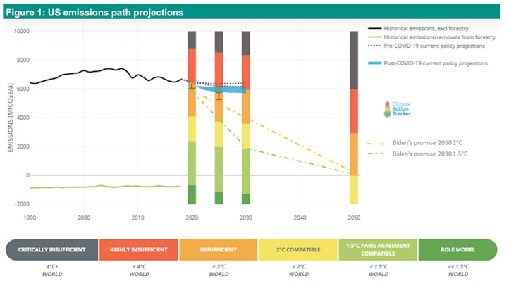 Biden’s promise combined with more ambitious 2050 commitments if linearly applied results in a roughly 1/3rd reduction in 2030 emissions. This would still be insufficient to ensure a 1.5°C future without ambitious 2030 targets.