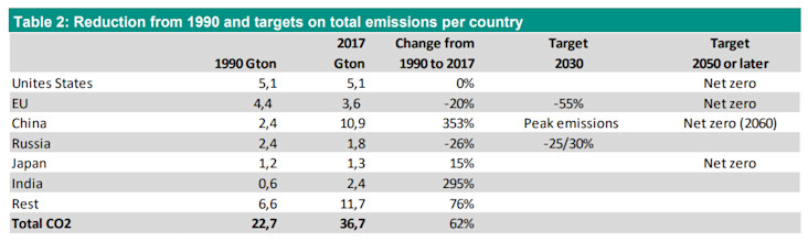 Combining statistics from various source, Table 2 summarises emissions from the largest global emitters with their latest publicly stated targets.