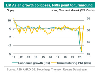 PMIs, foreign trade and capital flow data indicate that recovery from covid-19 collapse has started.Post covid-19 shock, we expect regional GDP to contract by ± 1% in 2020 and grow by 7.5% in 2021.North Asia is doing better than South Asia in terms of containing the virus and the economic damage. China, Taiwan and Vietnam are the only three countries with positive annual growth this year.Decline of (core) inflation has created room for post covid-19 easing wave.Pandemic fiscal support and falling revenues visible in deterioration fiscal indicators.