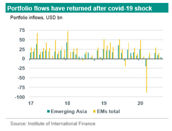 The covid-19 crisis hit emerging Asia through the capital flow channel as well. Given the unexpected nature of this crisis, market agents had to adjust their portfolios at an extremely high speed. That resulted in capital outflows from EMs in March that were larger than the amounts seen during any single month of the global financial crisis in 2008-09. That said, during the global financial crisis the outflow episode lasted for four months, while in the covid-19 crisis portfolio flows already started to cautiously return one month later helped by the sharp easing of monetary policy in the US. Emerging Asia has been hit as well in March, with the IMF estimating total portfolio outflows (through debt and equity instruments) at USD 19.5 bn. Also in EM Asia, portfolio flows started to return cautiously since April, with particularly June and July showing decent inflows. All in all, although there was a clear impact from the covid-19 shock, the region did relatively well in this respect.