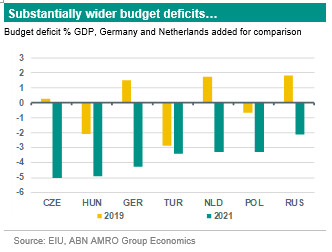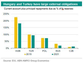 While the policy easing was pretty much universal both globally and in the region, the ability of EMs to afford the easing and absorb the pandemic shock varies greatly. Many countries in emerging Europe are relatively well-placed to weather shocks, with relatively low inflation and debt levels, and good access to capital markets. For the EU members, access to EU funds is positive, while the temporary loosening of the Maastricht criteria has diminished the risk of premature tightening hampering early-stage recovery. Financial conditions should remain broadly accommodative given that central banks globally – in particular the US Fed – have signalled their intention to keep rates lower for longer. Capital flows into most EMs are likely to be more solid compared to last year, given this and a better growth outlook. However, there will be sharply higher public debt burdens going forward. Public debt in Czech Republic is expected to grow from 30% of GDP at end-2019 to 46% at end-2021, but this is still a relatively low level. Poland’s increase in government debt also still leaves the government debt burden at a manageable level of 56% of GDP. Hungary was able to implement fiscal stimulus as the Maastricht criteria were loosened, but it still leaves the country with a government debt which is expected to stand at 75% of GDP by end-2021. While this is still a far cry from debt levels in some countries in the southern eurozone (Italy expected at 160% at end-21; Greece at 205%), debt interest payments on this government debt are higher than these countries. Mainly due to higher interest rate levels, interest payments take up almost 9% of fiscal revenues in Hungary, compared to 7% in Italy and only 3% in Greece. In Czech Republic and Poland interest payments on government debt take up a low 2-3% of fiscal revenues. Hungary also saw a sizeable external debt increase, while its external financing requirement for 2021 is large, making it less well-placed than the other CEE3.