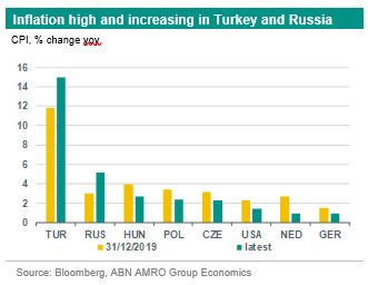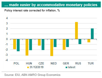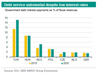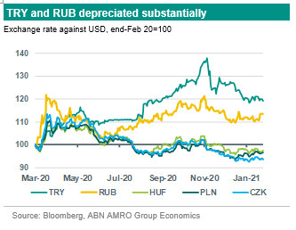 As mentioned, Turkey was obliged to reverse the monetary loosening to counter a sharp weakening of the Turkish lira and rising inflation. Inflation stood at 15% yoy in January of this year, as a result of high credit growth, increasing food prices and cost effects due to the currency depreciation. The 675bp increase in interest rates resulted in recovery of the lira, but also made Turkey’s key interest rate corrected for inflation one of the highest among major emerging markets. Partly as a result of this, and despite the fact that Turkey’s public debt is low at around 35% of GDP, interest payments on government debt are expected to increase from an already substantial level to stand at an estimated 15% of fiscal revenues in the current year. The buoyant credit growth, in combination with falling exports to Europe and a sharp drop in tourism revenues, caused a sizeable current account deficit to arise in 2020 (-4.4% of GDP), after a surplus in 2019. The current account is expected to improve markedly in the current year, to almost balance, and foreign-currency reserves have increased 30% since mid-November 2020 lows. Still, however, foreign-currency reserves stand about a third lower than pre-Covid-19 levels, at a relatively weak level, and the country’s high external financing requirement in relation to its foreign-currency reserves makes it vulnerable to changes in investor sentiment. The financial sector is expected to see increasing non-performing loans as sharply higher interest rates pinch businesses and households in 2021. Another risk to investor sentiment is Turkey’s tense relations with a.o. the EU and the US. In December 2020, both the EU and the US imposed sanctions on Turkey, but as the sanctions imposed so far only target a very limited part of the Turkish economy, the effects on the wider economy are expected to be comparatively small for now. A risk going forward is the imposition of further sanctions by the EU, possibly in tandem with the US, at the EU Summit scheduled for March 2021.