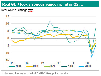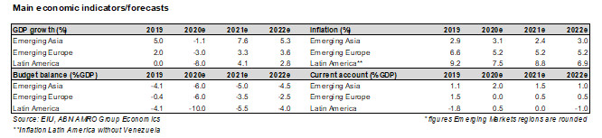 Emerging Europe expected to be back to pre-pandemic GDP levels per end-2021. With large variation between countries. Like elsewhere, unprecedented policy easing took place to counter the downturn CEE3 mostly relatively well-placed to weather the storm. Turkey: more orthodox policies, but external finances still weak. Russia: substantial shock absorption capacity, but economic activity to remain relatively weak and resource-dependent.