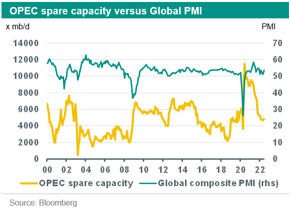 Also due to the supply side, the market reaction could be different than in the past. All eyes will be on the OPEC+ meeting on 3 August to see how OPEC+ will react to the market circumstances with Russian production and exports under pressure, whilst large oil consumers (like the US) have been asking for more crude to dampen high energy prices. Second, this time spare production capacity also may show a different reaction despite a drop in oil demand due to lower economic growth. Finally, a lack of investment is something that has been a long-running theme. Overall, the investments in exploitation have declined significantly in recent years. This also translates into lower future expected production capacity, both from OPEC and non-OPEC. Because of this, we think that the main risks for oil prices remain tilted towards the upside.