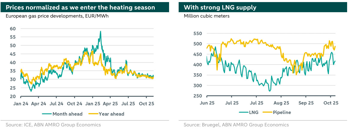 As Europe enters its final winter before new LNG capacity helps alleviate supply shortages, the storage levels this season will play a crucial role in determining the requirements for refilling storage during the following summer. The EU is entering the winter with its storage at 83% full, which would give the continent a thin but sufficient buffer to face emerging supply disruptions, and mute the impact of other geopolitical developments on prices. ccordingly, gas prices in Europe will remain responsive to emerging factors such as cold weather or weak wind conditions, which increase demand for heating and electricity purposes. Furthermore, we expect the momentum in industrial output growth to improve in 2026, backed by fiscal stimulus from higher defence and infrastructure spending, which would support TTF prices over the year. Accordingly, for the first quarter of this year, we expect TTF gas prices to average around €34/MWh, slightly below seasonal levels. This reflects lower seasonal demand due to a slowing global economy, partly caused by the impact of US tariffs, which are reducing industrial and power generation needs. Prices could fall further if the US-China trade war worsens. Looking ahead into 2026, we expect prices to gradually decrease as new LNG production capacity from the US, Canada, and Qatar comes online, easing the current tight supply situation. By the summer of next year, we expect prices to drop to around 26 EUR/MWh in Q3 leading to an average price of 30 EUR/MWh over 2026.