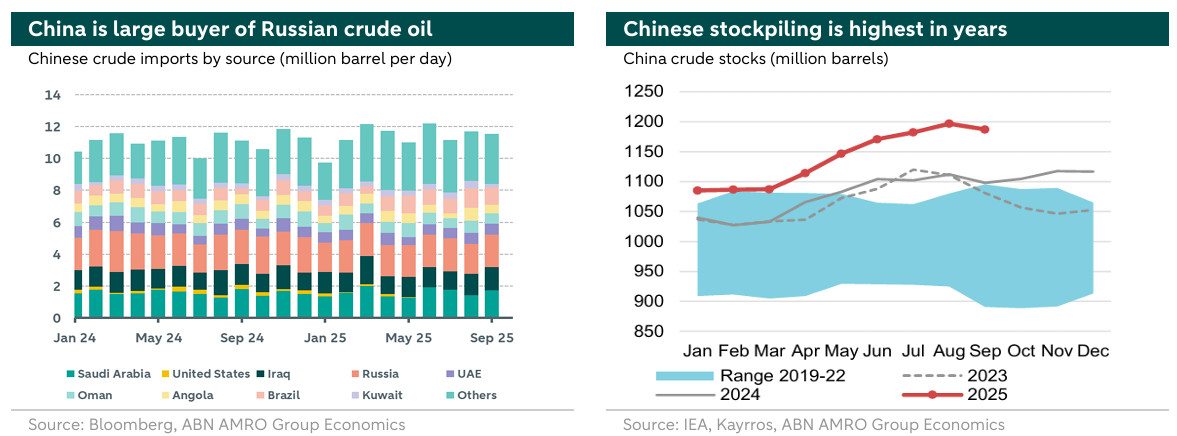 Despite these developments, crude oil prices have remained relatively elevated, with Brent crude trading above 62 USD/b. A key reason for this is China's stockpiling, which has absorbed much of the surplus at a rate of 0.53 to 0.9 million bpd. China's crude oil storage capacity, including both strategic petroleum reserves (SPR) and commercial storage, is estimated to be between 1.5 and 2 billion barrels. This includes underground facilities, tanks, and other storage infrastructure. So far, China has accumulated roughly 1.2 billion barrels, equivalent to about 70% of its storage capacity. This accumulation is highest in years, as illustrated in the right chart below. The graph further show a slowdown in the stocking rate for September. Chinese crude imports come from several suppliers, with Russia and Iran being top on the list (see right figure below), where China benefited from large discounts due to western sanctions on the two OPEC+ members.