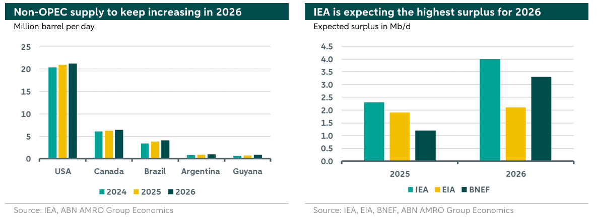 All in all, the market has been experiencing an oversupply throughout 2025. This was widely acknowledged by the main agencies, such as the International Energy Agency (IEA) and the Energy Information Administration (EIA) as well as research from BloombergNEF (BNEF). All three consistently raised their surplus estimates throughout the year. The IEA projected a surplus of 1.9 million bpd, while the EIA estimated 1.7 million bpd, as shown in the graph on the right. Looking ahead to 2026, the IEA expects the surplus to grow significantly, reaching a record 4 million bpd. The EIA projects a smaller increase, estimating 2.1 million bpd, while BNEF provides a middle-ground forecast of 3.3 million bpd.