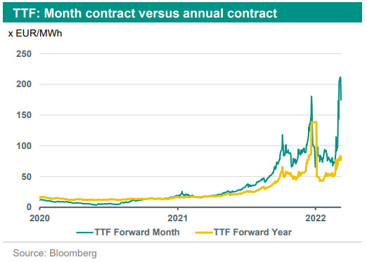 In the negative scenario, we do expect a full Russian supply disruption. This means a full ban of exports of both Russian oil and gas. Furthermore, we expect this situation to remain in place for longer (up to two years). The impact of a gas cut-off is particularly negative, due to its reliance on physical (pipeline) infrastructure, and the lack of LNG terminal capacity to replace Russian supply in the near term. Europe will be in full competition with Asia on the LNG spot market. Even higher energy prices will result in lower demand. When this is not enough, governments may force industry stoppages to prevent physical shortages of energy related commodities.