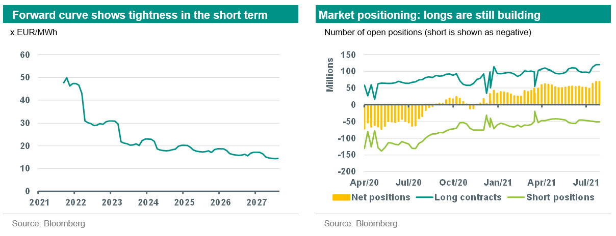 Market positioning shows that financial market participants think that prices have risen justifiably, and are still positioning themselves for a continuation of the price rally. This is reflected in the maintenance and further building of long positions (speculating on price rises). The net position has only increased further since the end of 2020 and is now at the highest point of the year. An assumption that prices were too low at the beginning of the year proved to be correct. There is no sign yet in the market positioning that the market sees an end to the tightness in the coming weeks. However, according to Gazprom, as much as 5.6 billion cubic metres of gas could be delivered to Europe this year via Nord Stream 2. That will not be enough to eliminate the shortages. However, it could be a reason for investors to take profits on their positions.