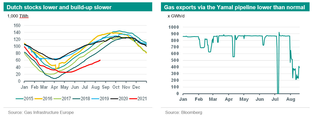 Although TTF gas prices may have overshot, given the current state of inventories, it is also unlikely that a substantial downward correction will occur in the short term. We think prices are elevated because some market participants fear possible physical shortages in the winter. This will not be the case as there is still the option to draw on back-up production capacity at the Groningen field. Obviously this is not desirable, and the Minister will only use this option in extreme cases. Nevertheless, this possibility of an emergency measure will ensure that we do not end up in the most negative scenario of physical shortages this winter. Also, as mentioned, the Nord Stream 2 pipeline will become operational in the fourth quarter, which may allow the Russians to export (even) more gas to North Western Europe. But the most important factor is and remains the weather. Unfortunately, it is not possible to predict whether we will have a harsh or mild winter. However, the market is now assuming the most negative scenario. Therefore, things can only turn out better than expected.