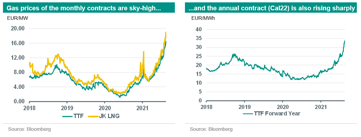 Stocks were already low after a harsher winter in gas-consuming countries in both Europe and Asia. The past few weeks have shown that gas exports from Russia to Europe have also been lower than usual. As a result, gas inventories are not nearly enough to face the coming heating season with confidence. This makes consumers and investors nervous. They are therefore going to hedge additional gas purchases on the futures market (current prices for future delivery) or speculate on price increases, which will put additional upward price pressure on contracts until spring 2022. For a couple of weeks, we see that this upward momentum in pricing is also spreading to the annual contract for 2022 (see graph above).