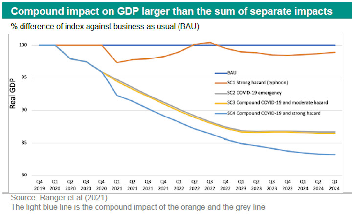 These compounding impacts should be dependent on hazard- and country specifics. combine a physical climate hazard and a Covid-19 emergency in different scenarios. In this example, firms’ revenues and production is hit by capital stock destruction from the natural disaster, while it is also hit by declining economic activity from the covid-19 emergency. This in turn hit firms’ profitability, which in turn transmits into, among others, employment and firms’ creditworthiness. This example also illustrates how indirect impacts can be larger than direct impacts. The indirect impact of both shocks in this example is on firms’ production and household demand, amplifying the impact. This in turn can then affect employment, wages, and households’ wealth, and this then creates a feedback on demand. This can lead to long-lasting effects on the economy. This study finds that the indirect impacts can be 50% larger than the scale of the sum of the individual shocks. Other research on historical instances of compound events also suggests that many major crises are caused by compound effects. The interaction of risks can give rise to a prolonged out of equilibrium state of he economy. Firms, households, and investors behave differently in these circumstances. The uncertainty leads to risk aversion and economic scarring. In particular, this refers to long-lasting effects and slow recovery (hysteresis).