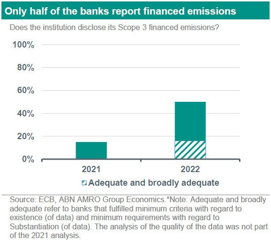 With the ESG data not yet touching upon all relevant information for investors, one could argue that the current data is not complete. A good example is, for instance, reporting on scope 3 emissions. While these account for the majority of banks’ emissions, a significant share of banks still does not include financed emissions within their scope 3 reporting (or does not assess their entire lending portfolio). According to the ECB, half of the EU banks do not report on scope 3 financed emissions, and 85% of those that do report, do not report it with an at least (broadly) adequate quality (see ).