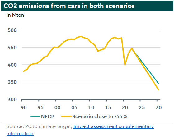 The impact assessment has detailed information about the CO2 emissions from transport including per sub-category. Indeed, the CO2 emissions from cars are expected to decline from 447 Mton in 2022 to 328 Mton for the close to 55% reduction and 345 Mton for the NECP scenario (see graph above). This is a decline between 23-27% (for the entire fleet). As also indicated above currently a large percentage of cars consumes fossil fuels. In 2030 cars burning fossil fuels are still expected to be dominant, but the role of battery electric is increasing to 11-14% of the total fleet.