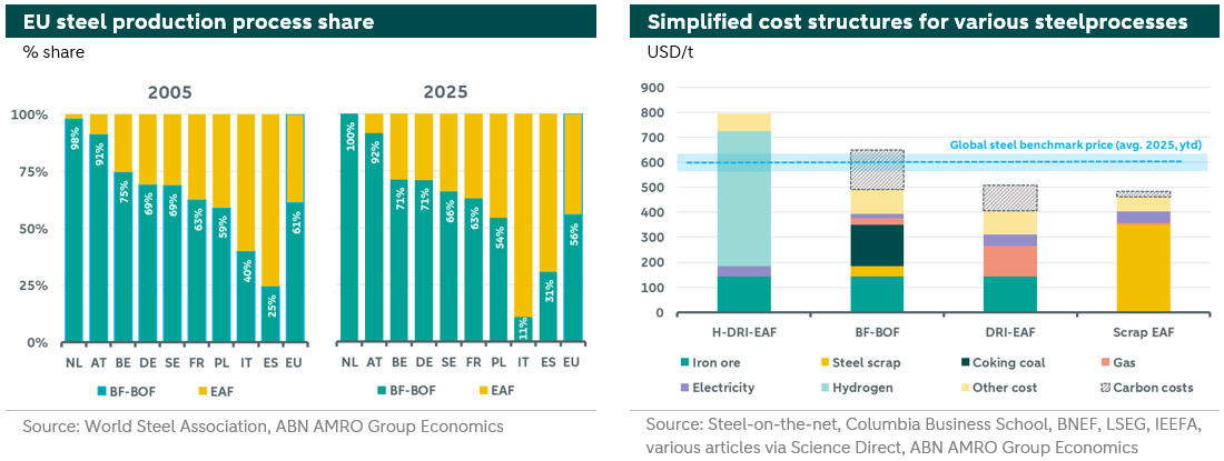 Our showed that the ratio between steel production via the BF-BOF route and via the EAF route can vary greatly from country to country. In the United States (US), for example, around 32% of total steel production is via the BF-BOF route, while the majority is via the EAF route. In China, the opposite is true. There, the bulk of steel is produced via the BF-BOF route, while only around 10% is produced via the less polluting EAF route. And in the EU, around 56% of steel is produced via the BF-BOF route in 2025, see also the figure on the left below. Twenty years earlier, this was 61%, so in this sense there has been no significant shift towards cleaner production methods. The figure also shows the distribution of production processes for the nine largest steel-producing EU countries.