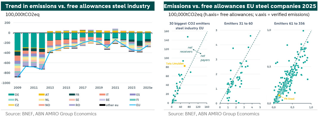 To allocate the number of free emission allowances per steel company within EU ETS, product benchmarks are used. This involves calculating the average emission intensity of the 10% most efficient installations in the steel industry. Subsequently, all the EU ETS companies in the sector are compared with this benchmark. The free emission allowances are then calculated and allocated using a formula. Within the EU ETS system, companies may be eligible for more free emission allowances than they need. These are the companies that are less emission-intensive than average and therefore the most efficient. In this way, the pioneers with cleaner installations are supported. Steel companies with higher than average emission intensity must purchase additional emission allowances. The three figures on the right above show that many large emitters belong to the most efficient companies. These are mainly companies from the German steel industry, which consistently receive a significant proportion of the free emission allowances from the EU ETS each year. Tata Steel IJmuiden (the yellow dot in the first graph on the right above) also belongs in this manner to the category of most efficient companies. The other Dutch steel companies that fall under the EU ETS according to Bloomberg NEF data (FN Steel and Climax Molybdenum BV, see yellow dots in the far right figure) have to purchase emission allowances on balance and are therefore less efficient than the 10% most efficient once in the sector according to the EU ETS definition. This encourages in theory both companies to become more sustainable.