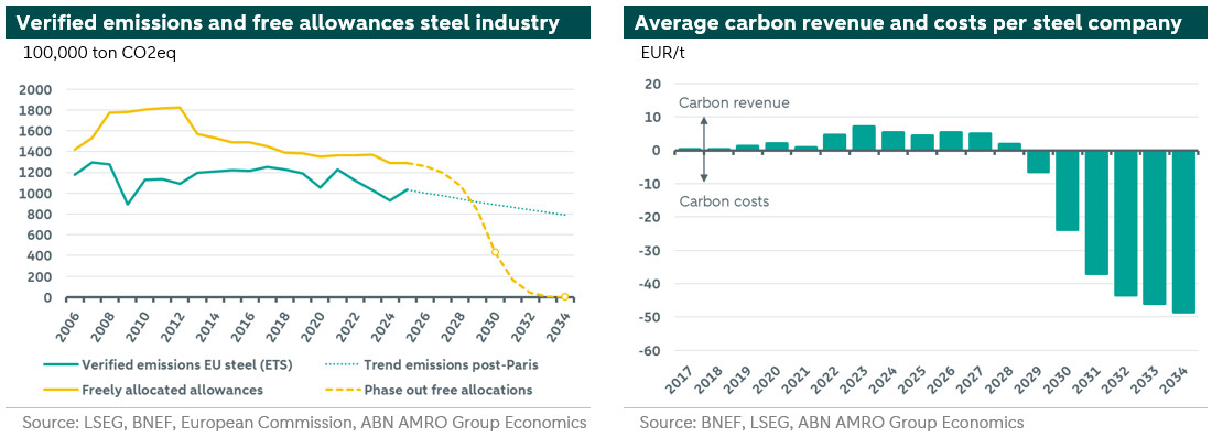 As higher carbon costs increase the risk of carbon leakage, the EU is implementing the Carbon Border Adjustment Mechanism (CBAM). Free emission allowances will be gradually phased-out alongside the phase-in of CBAM from 2026 onwards. This will help to secure to some extent a level playing field with countries outside the EU that have little or no carbon costs. The reduction in free emission allowances will take place in predetermined steps each year. This is shown in the figure on the left below for the steel sector (see yellow dotted line). The reduction in free emission allowances will be relatively swift, with a reduction of 48.5% in 2030. By 2034, the total amount of free emission allowances must be reduced to zero. As a result, emissions from steel production in the EU will gradually be ‘penalised’ between 2026 and 2034, thereby encouraging steel companies to become more sustainable.