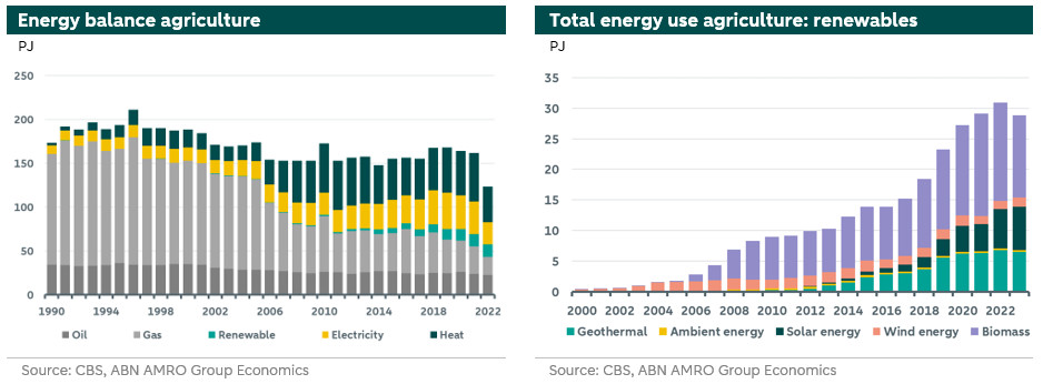 The total consumption of natural gas in the agricultural sector is dominated by greenhouse horticulture. This consumption has a strong correlation with CO2 emissions, as shown in the left figure below. Due to the double dip caused by the pandemic and the energy crisis (2020-2022), gas consumption and CO2 emissions decreased more sharply. But after these crisis moments, an upward trend in both indicators is visible again. The positive signal from a climate perspective is that pre-crisis levels have not yet been reached.