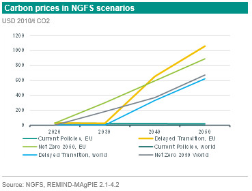 Carbon pricing is the main driver for the energy transition process as it provides incentives for different economic agents to switch towards a more sustainable low carbon practices. Accordingly, the level of carbon pricing plays an important role in governing the speed of the transition towards a certain climate goal. Scenario analysis is used to compare different pathways to reach such a goal under different levels of carbon pricing over time. The figure below depicts the carbon prices associated to different transition scenarios developed by the Network for Greening the Financial System (NGFS). The figure shows that the level of carbon price differs depending on the transition process under different scenarios. The timing of the introduction of an effective carbon price is of a high importance here. The delay in addressing emissions means that a higher carbon price will be needed to achieve the same climate goal. Accordingly, the carbon price is typically higher in the Net Zero scenario – particularly this decade - than in less ambitious scenarios. Furthermore, the carbon price to reach the same emission reduction target differs between different regions of the world due to differences in opportunities and sectoral composition to reduce emissions.