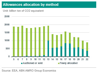 The development of the ETS went through several phases. The first phase (2005-2007) had a ‘learning by doing’ approach, covering power generation and energy-intensive industries with mostly free allocation of allowances. It succeeded in establishing a carbon price and the needed infrastructure for monitoring emissions. Phase 2 (2008-2012) witnessed an extension of the number member countries, where a small portion of allowances were auctioned, and businesses could use international credits to cover their CO2 emissions. The phase further witnessed the development of Union register. In Phase 3 (2013-2020) allowances were auctioned by default along with harmonized allocation rules for the remaining allocations. This phase also attested the inclusion of more sectors and gases and the setting up of New Entrant Reserve and a single cap on emission on the European level. We are currently in phase 4 (2021-2030) which was revised in July 2021 by the European Commission through a series of legislative proposals (the ‘fit for 55’ package and the REpowerEU plan). The revision aimed to help meeting the EU climate targets for 2030 and 2050. It involved a faster annual reduction of emissions (annual linear reduction factor of 4.2% versus. 2.2% previously), reinforcing the Market Stability Reserve, addressing the risk of carbon leakage, and setting innovation and modernization funds to boost the transition towards a low carbon economy. Allocation of allowancesAllowances are allocated among covered sectors and between installations either through auctioning or are given for free. There are rules governing the specifics of each method of allocation. The figure below shows how the allocation of allowances has developed over the EU-ETS lifetime.