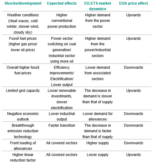 Under the same transition scope, there is a link between anticipated bottle-necks to the energy transition and the carbon market. For example, delays in grid capacity extensions would slow down renewable power capacity building, which in turn will hinder the development of green hydrogen that is needed for the transition of heavy industry. The combination of the slower industrial transition and the ongoing reduction of the cap will increase the EUA price. Noting that one way to avoid/mitigate this kind of dynamics would be for Europe to rely on imports for green hydrogen. However, in either case, the international competitiveness of European industries is affected (footnote 3). First, by the high cost of allowances, and second by the reliance on more expensive imports. The table above summarizes main developments and their potential effect on EUA price.