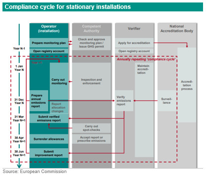 A 3% of the auction quota is reserved as a uniform cross-sectional correction factor that can be applied in case the volume available for free allocation is higher than the calculated one. The portion of that buffer that is not used is allocated to the innovation fund (50 million allowances max), the modernization fund (0.5% of total union cap), and auctioning (the remainder) (footnote 1).Free allocationSectors, other than power generation, are entitled to receive some share of their allowances for free in order to protect these sectors from the risk of carbon leakage - the relocation of installations to regions with laxer climate policies. The aviation sector receives most of its allowances for free because of the international nature and the high risk of competitiveness loss in this sector. More precisely, for aviation, 82% of the dedicated allowances are allocated for free, 15% are auctioned, and 3% are dedicated for the support of new entrants. Free allocation after phase 3 was based on benchmarks. These benchmarks are determined by the average emissions of the 10% best performing installations in a certain industry/sector. Accordingly, best performing installations will receive all their needed allowances for free, while those with lower efficiency will need to either reduce their emissions or buy the difference of their needs from the market. For phase 4 and from 2021, 43% of the Union cap is given for free. An indicator that is based on trade and emission intensities is being developed to distinguish between the sectors that are highly exposed to carbon leakage risk and those sectors that are less exposed. Free allocation of allowances will stay in place for highly exposed sectors. For other less exposed sectors, free allocation will be gradually phased out from a maximum of 30% in 2026 to zero in 2030. Also, some free allowances are available for the modernization of the power sector in some member states to be dedicated for investments that contribute to the diversification of the energy mix, clean technologies, or infrastructural upgrade. Furthermore, under the new reforms, some free allowances will be dedicated to new and growing installations. At the end of the compliance cycle, installations failing to deliver the required number of permits to cover their emissions pay a penalty. The figure below summarizes the compliance cycle for stationary installations with the most important dates and deadlines.