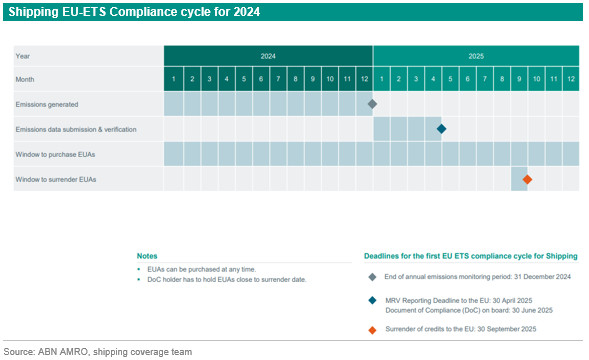 The International Maritime Organization (IMO) sets rules and regulations to decarbonize the shipping industry. In comparison with the EU-ETS, the IMO approach is based on rating vessels based on their productivity, emissions, and the distance travelled. This rating is then used to penalize ships that falls below a certain threshold. The EU-ETS on the other hand provides monetary incentives to shipping companies to reduce their emissions which is a more efficient approach to achieve climate targets for the sector.The existing Monitoring, Reporting and Verification (MRV) system under EU-ETS will be extended and revised to include ship sizes, types, and associated GHG emissions. The MRV system will be used to report and verify maritime shipping emissions. However, compliance and emission coverage will be gradually phased in, with 40% of emissions covered initially, 70% by 2025, and 100% as of 2026. Accordingly, vessels above 5000GT of maritime cargo or passengers for commercial purposes are covered for 100% of their emissions for intra-EU voyages, and 50% for international voyages starting from 2024. Offshore ships above 5000GT will be covered as of 2027, while for general cargo and offshore ships the phase in of vessels under 5000 and above 400 tonnages is still to be evaluated and determined in 2026. Shipping companies will have to surrender allowances on the emissions they have reported in the previous year. Thus, starting from 2025, companies have to surrender allowances. There will be no free allocation of allowances. Accordingly, an additional 80 to 100 million emission allowances will be added to the market. Most of the auction revenues for these allowances will be at the disposal of member states for climate and energy related activities, while the revenues of 20 million allowances will be dedicated to the innovation fund for shipping related projects. Allocation of allowances among countries will take into account the presence and size of the shipping industry, where countries with relatively larger shipping presence could receive 3.5% of the ceiling of the auctioned allowances to be allocated among them. With respect to the GHG emissions coverage, in the first two years (2024 and 2025) only CO2 will be in scope. Later on and starting from 2026, all GHG (footnote 7) will be in scope for the maritime sector. See more on the EU-ETS shipping extension in .Practicalities for shipping companiesEvery shipping company should open a registry account at their corresponding authority. International companies can register in any EU member state of their choice. Every shipping company should surrender allowances that cover their position in their compliance account at their corresponding national administrative authority. The company can seek reimbursement of the cost from the entity responsible for the ship emissions. Furthermore, shipping companies can acquire allowances from the primary market by participating in auctions that are held by the European Energy Exchange (EEX), or from secondary market. Companies can access the EU-ETS market directly or indirectly through intermediaries, such as banks, brokers, or professional access providers, noting that the minimum size in primary auctions is 500 EUAs (= 500 MT CO2). The EU-ETS compliance cycle is summarized in the figure below.