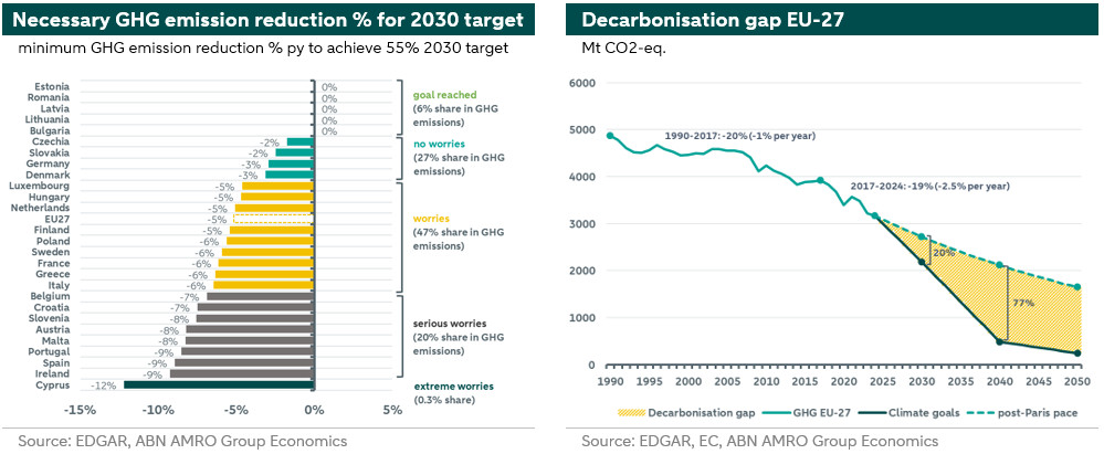 The Czech Republic, Slovakia, Germany, and Denmark do not seem to have anything to worry about. These countries—which together account for 27% of total GHG emissions in the EU-27—will be able to achieve the 2030 target if they manage to maintain the GHG reduction rate seen in the period 2017-2024. In the other EU-27 countries, concerns about the feasibility of the 2030 target are greater. For the countries with a combined share of 47% of total EU emissions – the yellow bars in the figure on the left below – concerns remain about the feasibility of the 2030 target. For more than 20% of EU emissions, much greater concerns remain. Each country faces its own individual challenges in this regard.