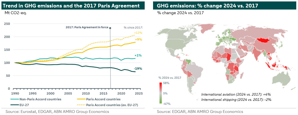 The EU has ambitious climate goals. For example, the European Climate Law sets a binding target of achieving climate neutrality by 2050 and reducing net GHG emissions by at least 55% by 2030 compared to 1990 levels. Pursuing these goals has clearly made the EU a pioneer in decarbonisation. Between 2017 and 2024, GHG emissions in the EU fell by 19%. The difference with other countries is considerable. In many countries in Asia and Africa, GHG emissions actually increased between 2017 and 2024. The most striking feature of the figure on the left above is that GHG emissions in countries that have not signed the Paris Agreement – including the US – have increased much less than in countries that are party to the agreement. But this is mainly due to trends in the US. The other non-Paris Agreement countries – many of which are in Africa, but also include Iraq, Iran, and Turkey – saw their GHG emissions increase by 15% in the period 2017-2024. In the US, emissions decreased by 4% in the same period.