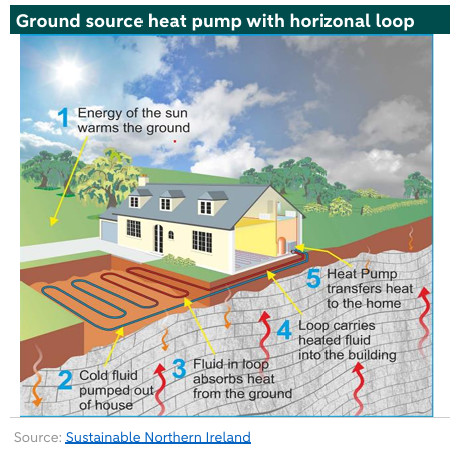 A closed (horizontal) loop works as follow. the Sun warms the Earth (1). The cold fluid pumped out of the house (2) extract the heat from the ground (3). The heated fluid is carried into the house (4). The heat pumps heat the water further and transfer the heat to the home (5). The cold fluid is pumped out of the house.