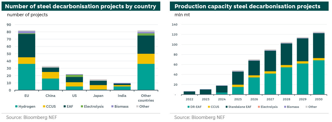 Despite relatively weak market conditions, several global decarbonisation projects in the steel industry are underway. According to Bloomberg New Energy Finance (BNEF), most of these projects originate in Europe. Many focus on EAF-based production or hydrogen-based processes for converting iron ore into iron. Expectations for hydrogen in the coming years are particularly high.