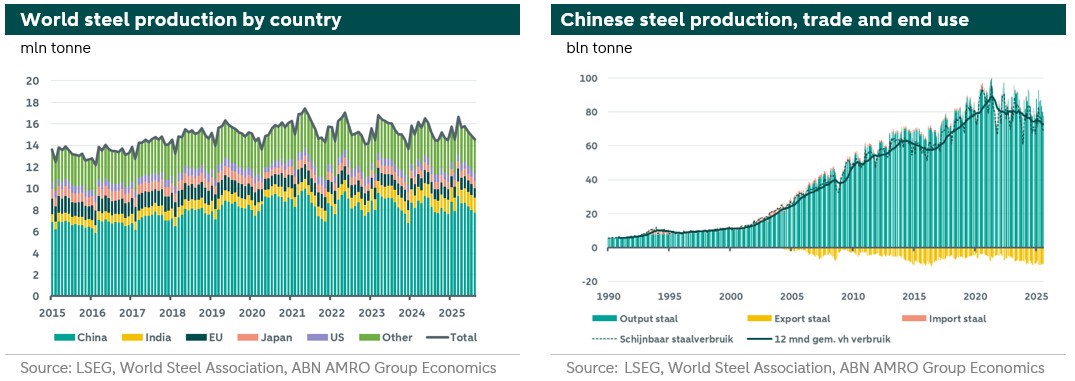 As of August this year, global steel production has fallen by almost 1% compared to the same period last year, continuing a trend over the past five years where production has remained relatively stable. Overcapacity, low utilization rates, and weak demand are currently plaguing the global steel industry. In particular, demand in China has been relatively weak since 2021, due to declining activity in the real estate and infrastructure sectors. With a 55% share in global steel production, trends in China heavily influence the global steel sector, especially in international trade.