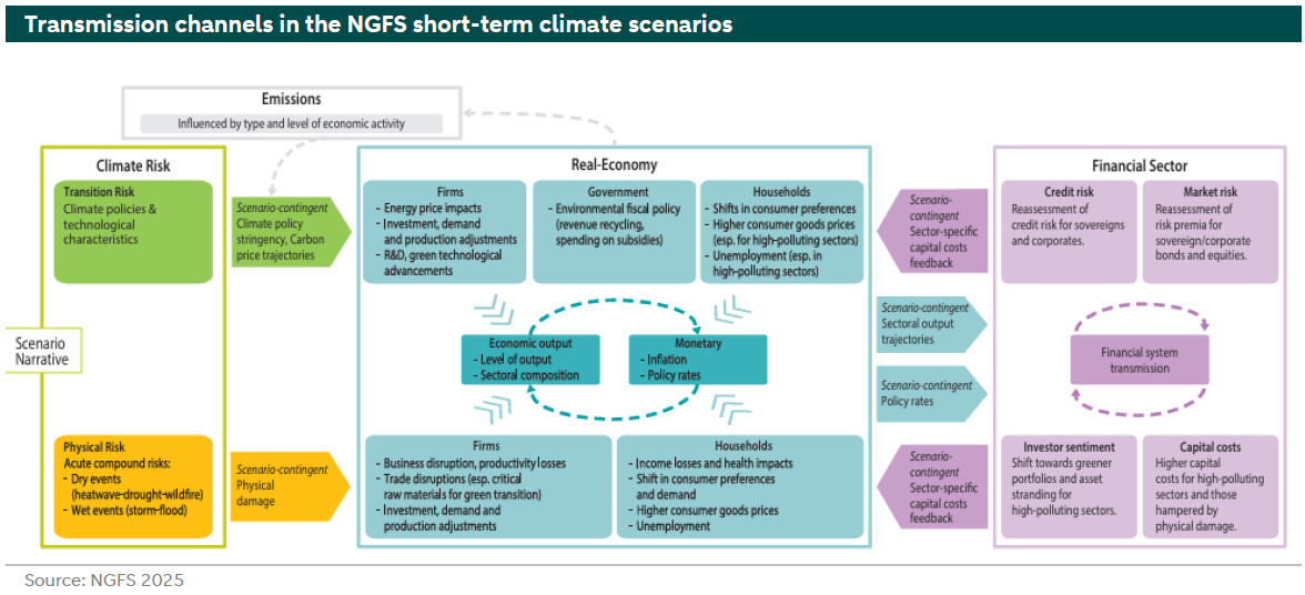 The NGFS climate scenarios are a well-known starting point for the analysis of the impact of different climate futures. Until last year, these scenario sets ran until 2050, as this has been the point at which Net Zero should be met in a 1.5 ̊C global warming scenario. The short-term scenarios were first published in the form of a in October 2023, and in May of this year the was published. The 5 year time horizon is meant to make it more relevant for policy and planning. Arguably, within a 25-year time horizon the impact of certain shocks would die out before the end of the time horizon, making the impact seem more moderate than it was. This goes in particular for severe weather events, which could have a substantial but largely temporary impact on the economy. Also, long-term scenarios may not reflect fully shorter-term dynamics, such as supply-chain disruptions and financial markets effects.