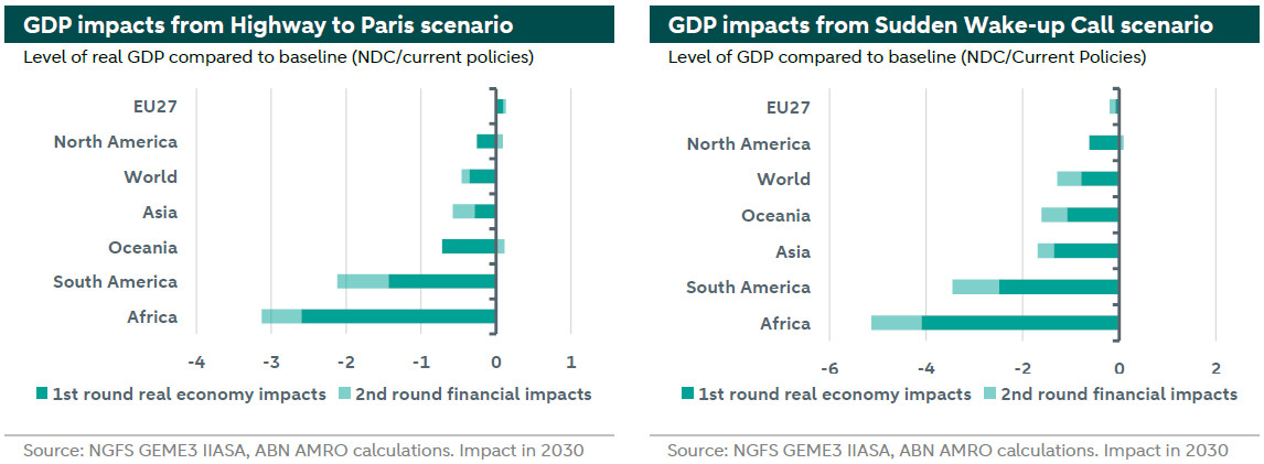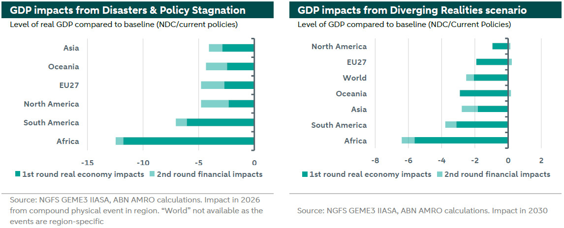 The physical risk scenarios illustrate that regional extreme weather events can generate temporary but material GDP losses with potential consequences for the world economy