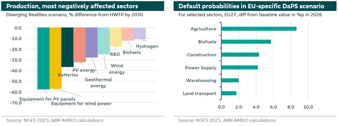 Transition scenarios affect the creditworthiness of emission-intensive sectors most, while agriculture and other capital-intensive industries are impacted most by physical scenarios