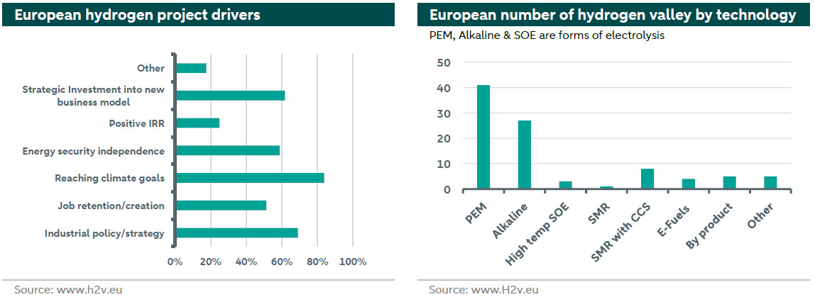 There are leading hydrogen projects across the EU, such as the HH2E electrolyser project — set to become one of Germany’s biggest and the Holland hydrogen 1 with a capacity of 200MW. In order to understand the dynamics of hydrogen development in Europe, we need to understand the main drivers of hydrogen investments. In a survey about the drivers leading hydrogen projects in Europe, the majority of respondents (84%) identified “reaching climate goals” as a leading driver. “Industrial policy” and “strategic investments into new business models” are also two of the main drivers for hydrogen development, as can be seen in the chart below (left). An overview on the current number European hydrogen valleys and the associated technology is shown in the right hand chart below.
