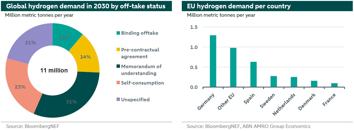 Global hydrogen demand remains low compared to that of supply, with only 12% of global clean hydrogen production capacity planned for commissioning by 2030 (61 million metric tons) having identified an off-taker, as of April 2024 (see left hand chart on below for off-takers status). At the same time, there is just 11% of these contracts with binding status, highlighting the demand uncertainty, which in turn affects the incentives to develop the supply further. We note that, according to BloombergNEF, the growth in hydrogen demand is faster in power, steel and renewable fuels compared to other traditional usage sectors such as oil refining and fertilizers.